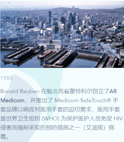 Medicom 创始人罗纳德·鲁本 (Ronald Reuben) 年仅 23 岁时,与一位朋友的一次谈话改变了他的人生轨迹。从那次谈话中,鲁本了解到,艾滋病危机导致医护人员迫切需要个人防护装备。凭着他的创业本能和有所作为的愿望,他立即着手开发SafeTouch 品牌下的高品质医用检查手套。